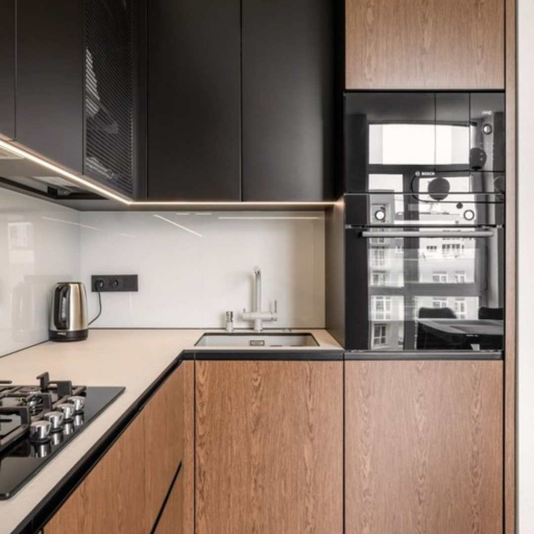 Кухня має форму літери «L» і пропонує багато простору та робочих поверхонь